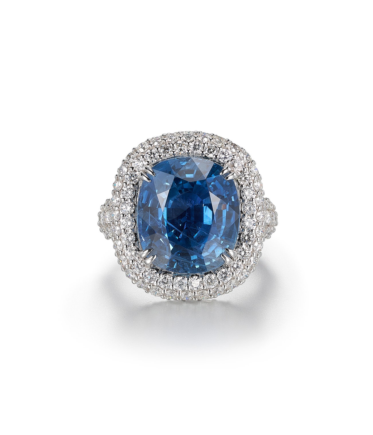 Set with a cushion-shaped sapphire weighing 11.98 carats, accented with brilliant-cut diamonds, size 53.