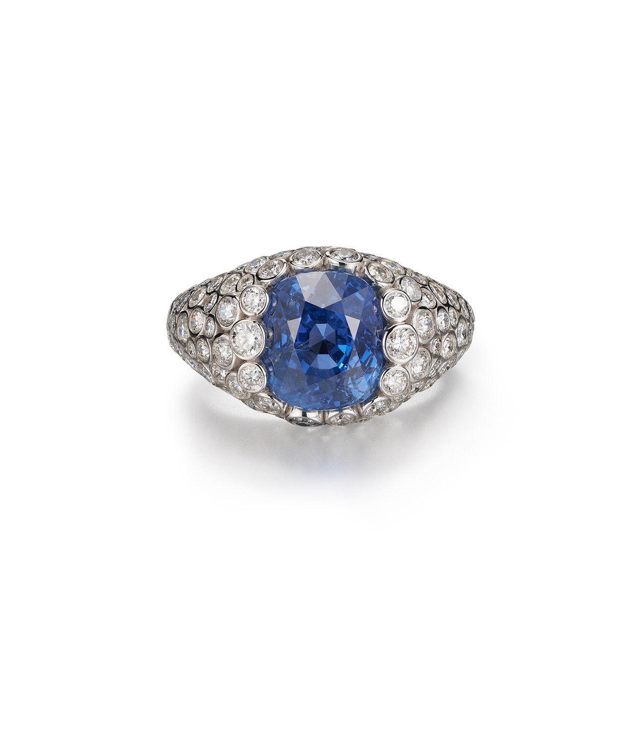 Set with a cushion-shaped sapphire weighing 5.20 carats, the surround collet-set with brilliant-cut diamonds, size 52.