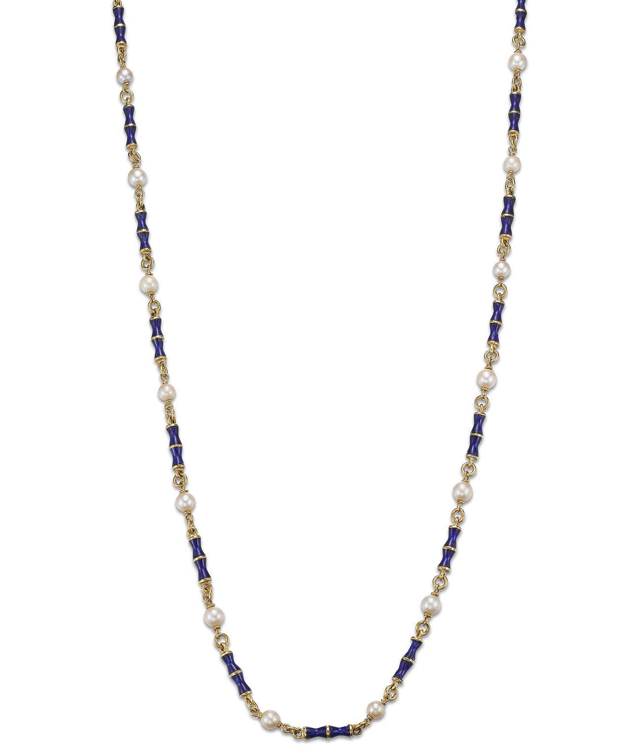 The gold chain embellished with alternating seed pearls and blue enamel posts, length approximately 1010mm.