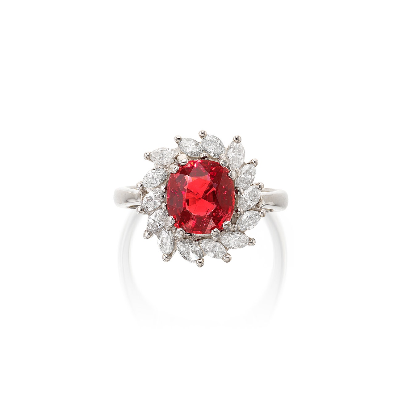 Set with a cushion-shaped red spinel weighing approximately 2.42 carats, within a surround of marquise-shaped diamonds, mounted in white gold, size 6¼.