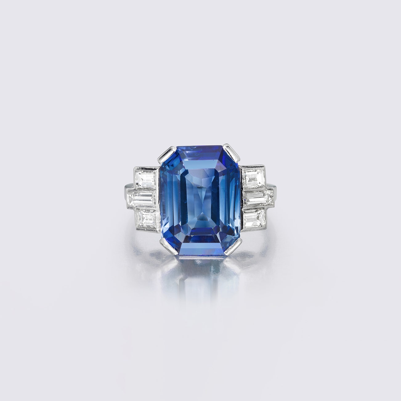 Set with a rectangular-shaped sapphire weighing 9.53 carats, accented by baguette diamonds, mounted in platinum, size 5, with maker's mark.
