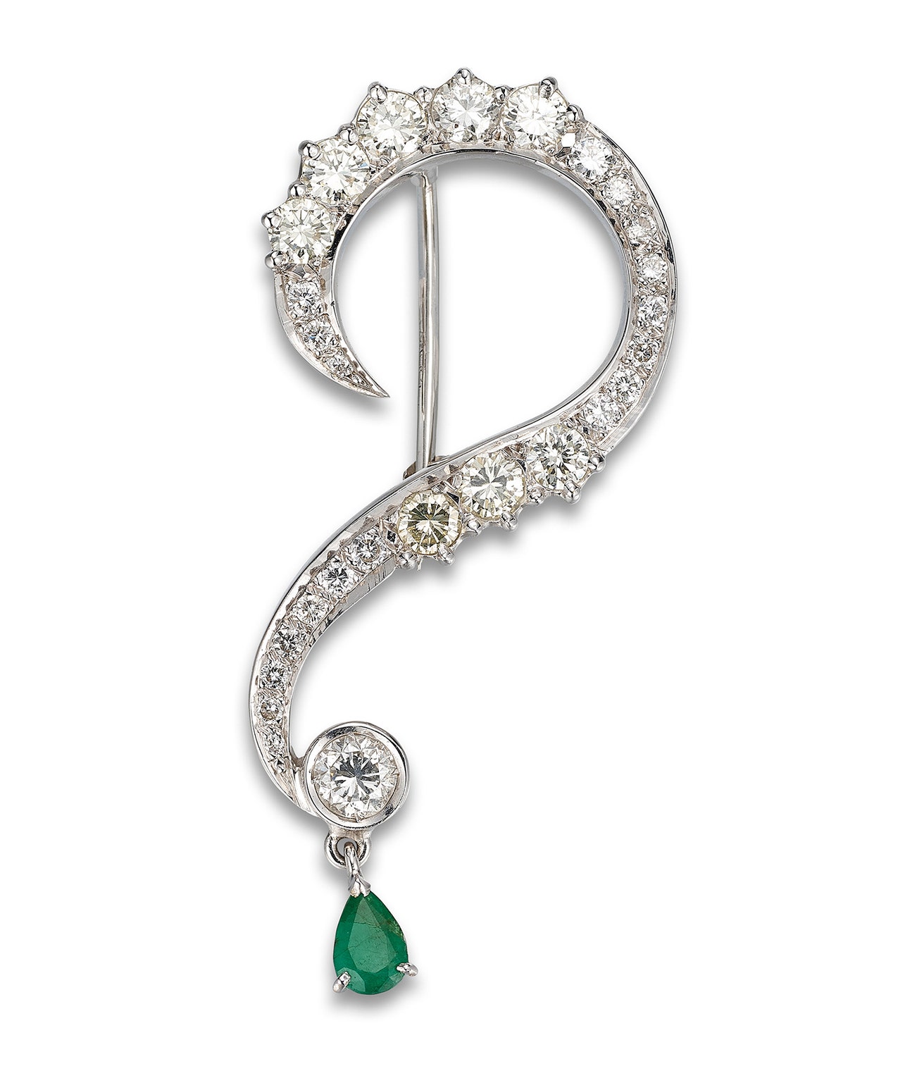 Designed as a question mark, set throughout with brilliant-cut diamonds, supporting a pear-shaped emerald, measuring approximately 50 x 20mm.
