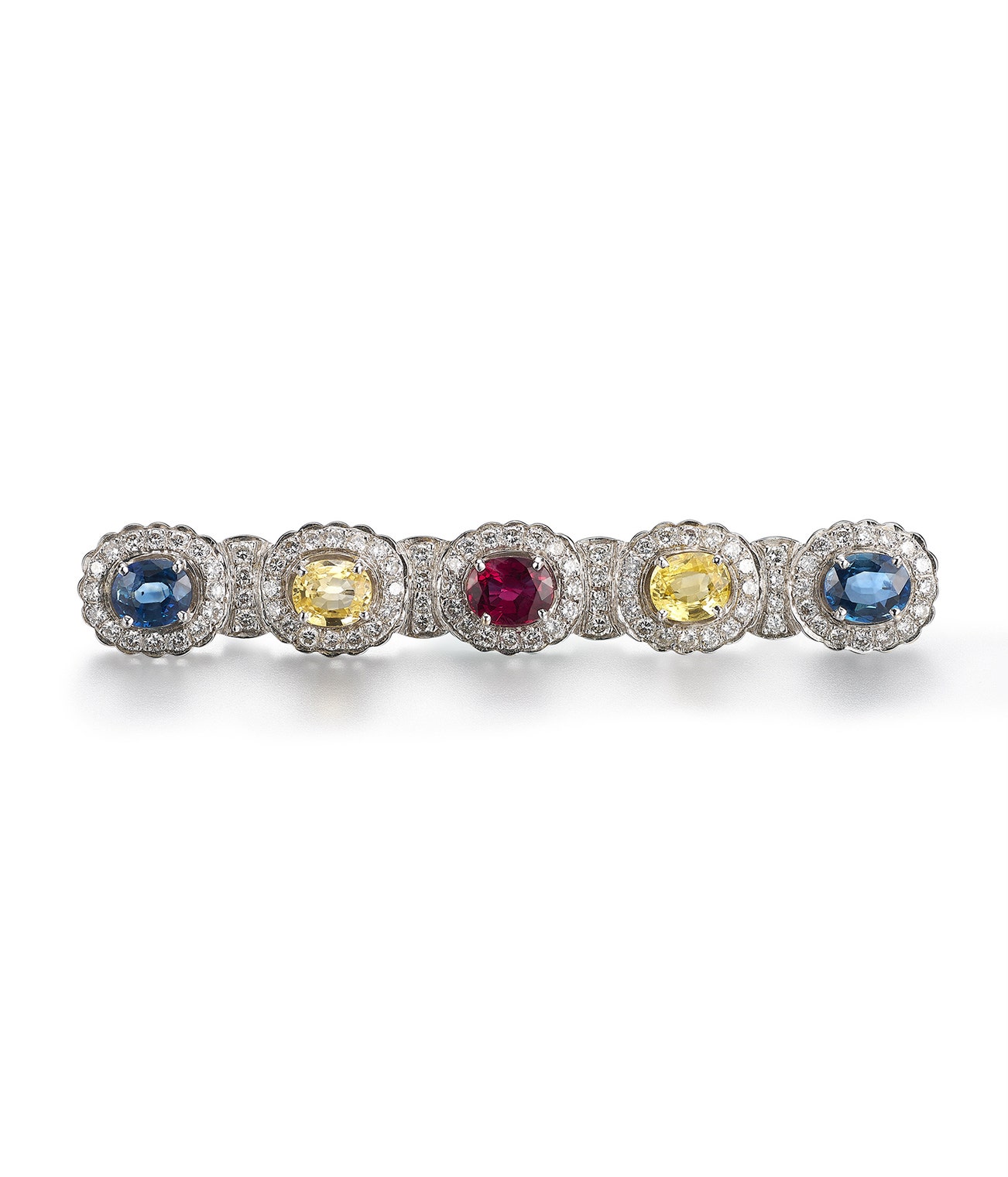 Set with an oval ruby, oval sapphires and yellow sapphires, accented with brilliant-cut diamonds, length approximately 70mm.
