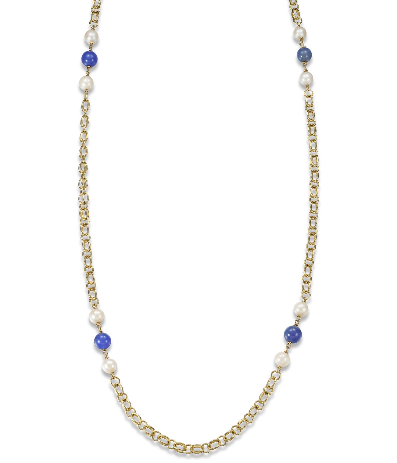 The gold chain embellished with blue chalcedony beads and cultured pearls, length approximately 945mm, Italian maker's mark.