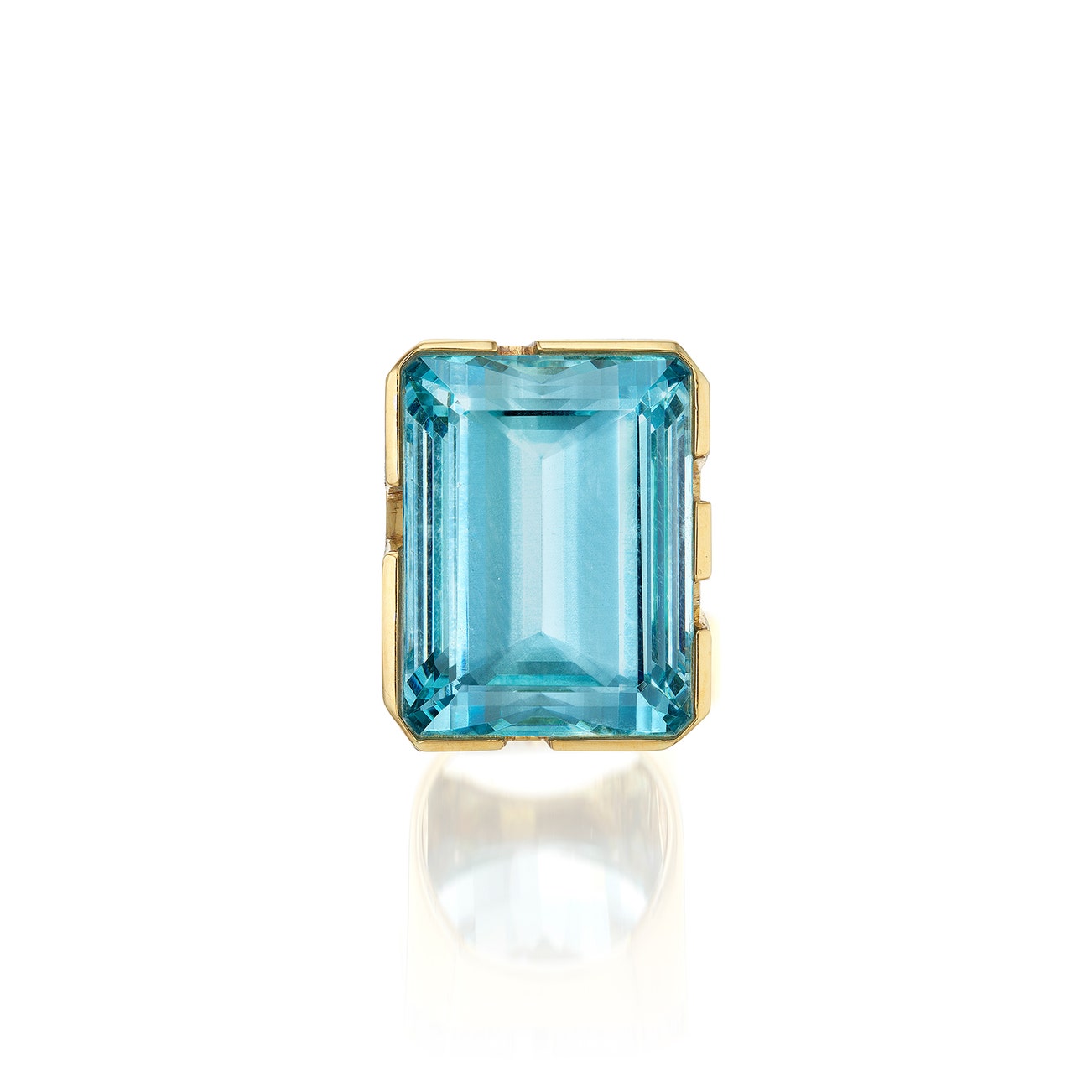 Set with a step-cut aquamarine, the border decorated with brilliant-cut diamonds, mounted in yellow gold, size 6½.
