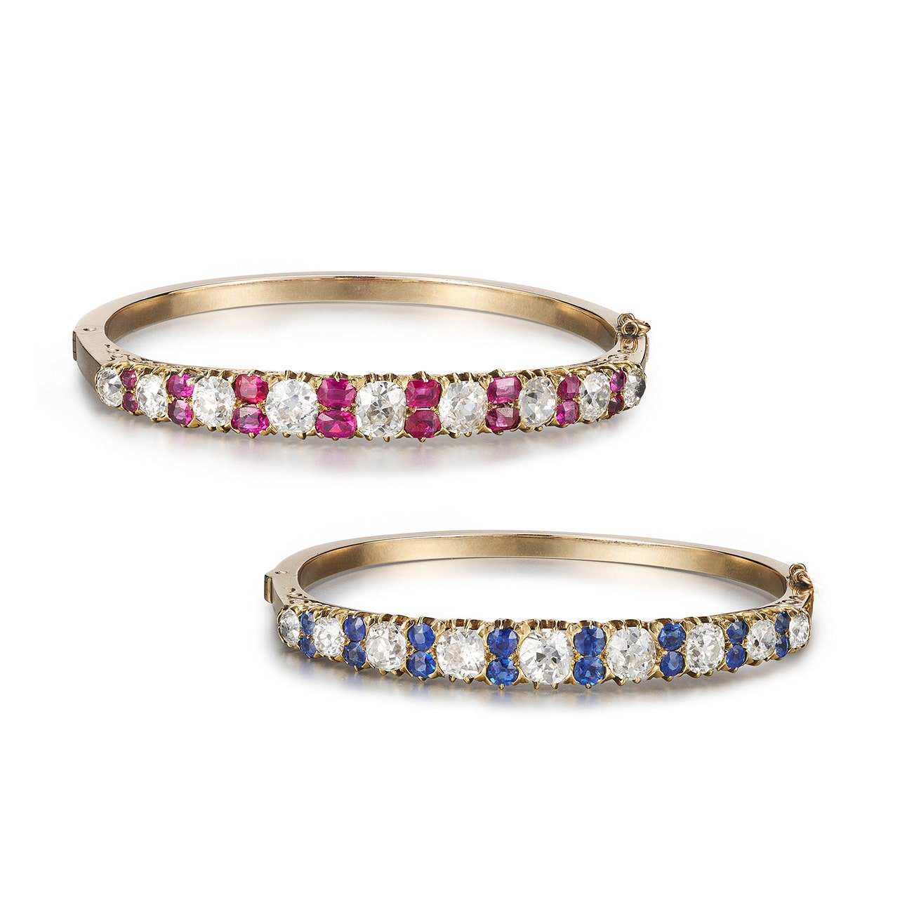 Each set with circular-cut diamonds, one embellished with oval sapphires, inner circumference approximately 155mm, the other with oval rubies, inner circumference approximately 160mm, fitted case stamped Bentley & Skinner.