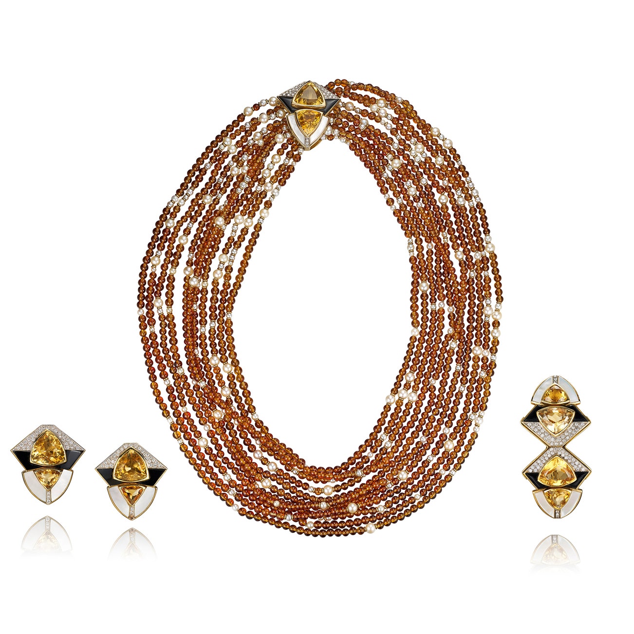 Comprising: a necklace, set with eleven strands of citrine and cultured pearl beads, the clasp applied with onyx and mother-of-pearl, set with triangular citrines and brilliant-cut diamonds, length approximately from 490mm to 720mm, a brooch, measuring approximately 80 x 40mm, and a pair of earrings, length approximately 35mm, post and hinged-back fittings, signed Luana Francisci.