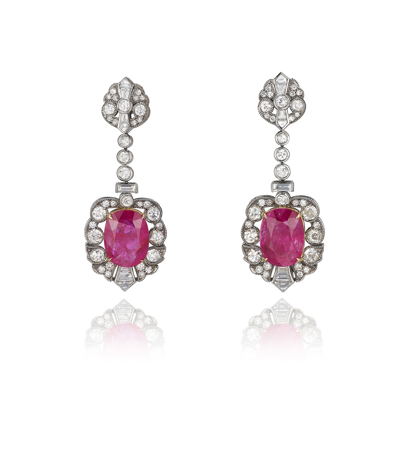 Each set with an oval ruby weighing 4.66 carats and 3.72 carats, highlighted with circular-cut and baguette diamonds, length approximately 43mm, post and butterfly fittings.