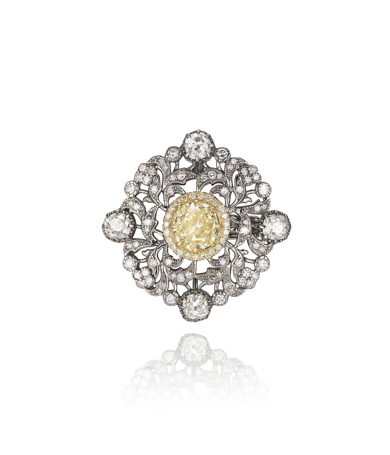 Of openwork design, set with a central cushion-shaped fancy intense yellow diamond weighing 2.02 carats, highlighted with baguette and circular-cut diamonds, and circular-cut diamonds of yellow tint, measuring approximately 40 x 30mm.