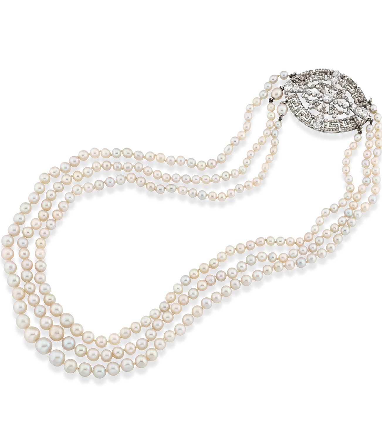Composed of three strands of natural pearls measuring from 3.50mm to 7.60mm, the clasp set with circular-cut diamonds, length approximately from 425mm to 495mm.