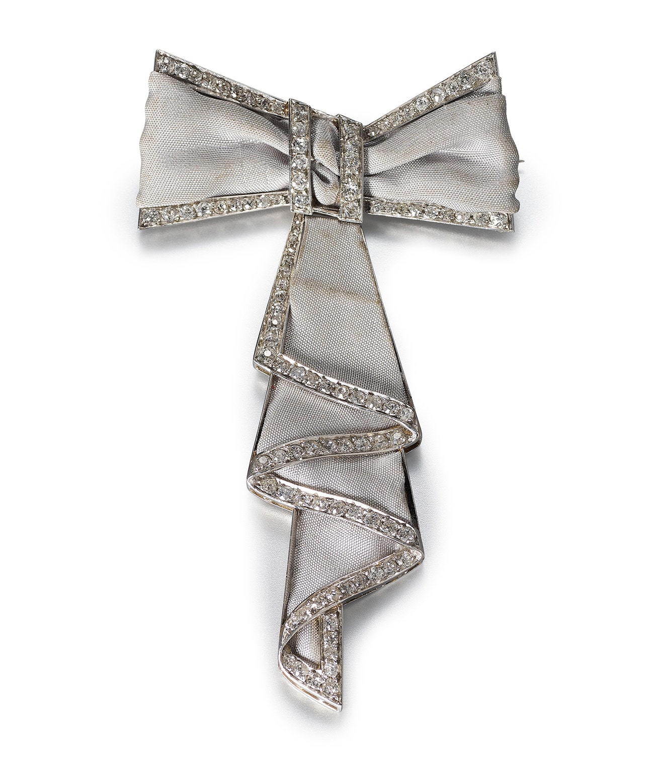 Modelled as a bow, the articulated ribbon embellished with grey silk and circular-cut diamonds, measuring approximately 72 x 45mm.
