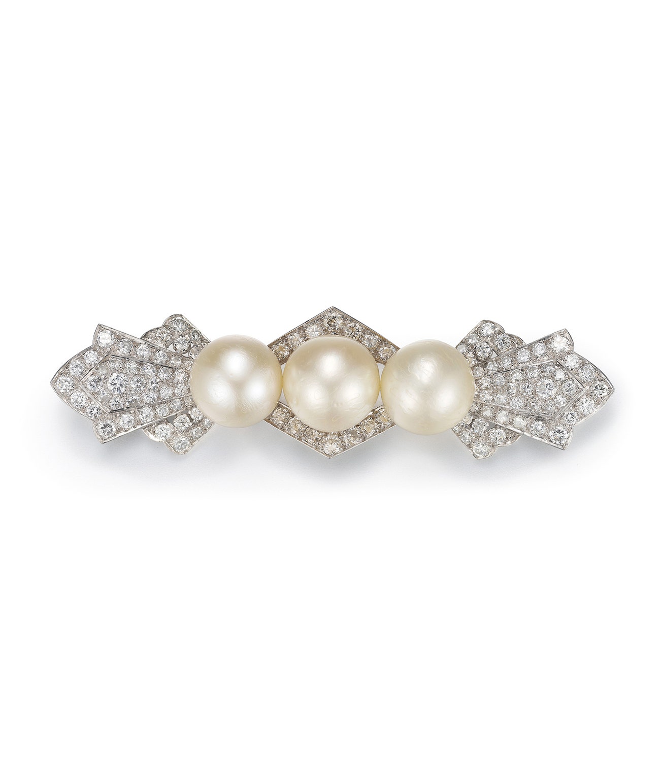 Set with three button-shaped cultured pearls, highlighted with circular-cut diamonds, measuring approximately 22 x 90mm.