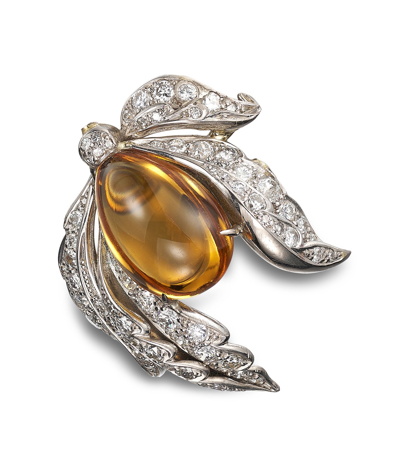 Modelled as a leaf, set with a pear-shaped cabochon citrine, highlighted with circular-cut diamonds, measuring approximately 30 x 30mm.