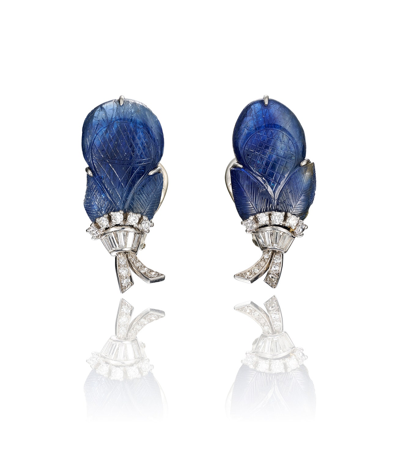 Each set with a carved sapphire, highlighted with circular-cut and baguette diamonds, length approximately 33mm.