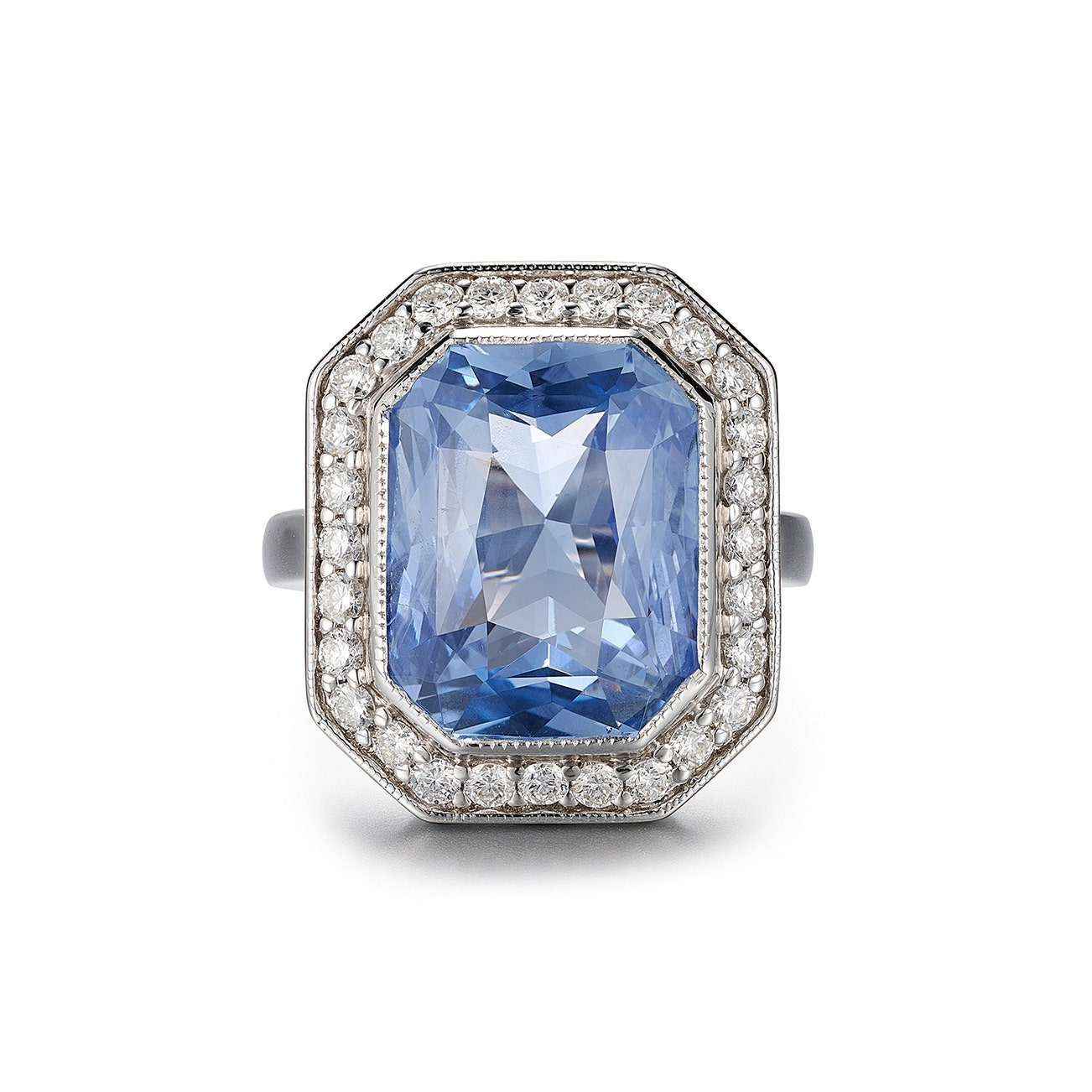 Set with an octagonal sapphire weighing 11.37 carats, within a halo of brilliant-cut diamonds, size 50.