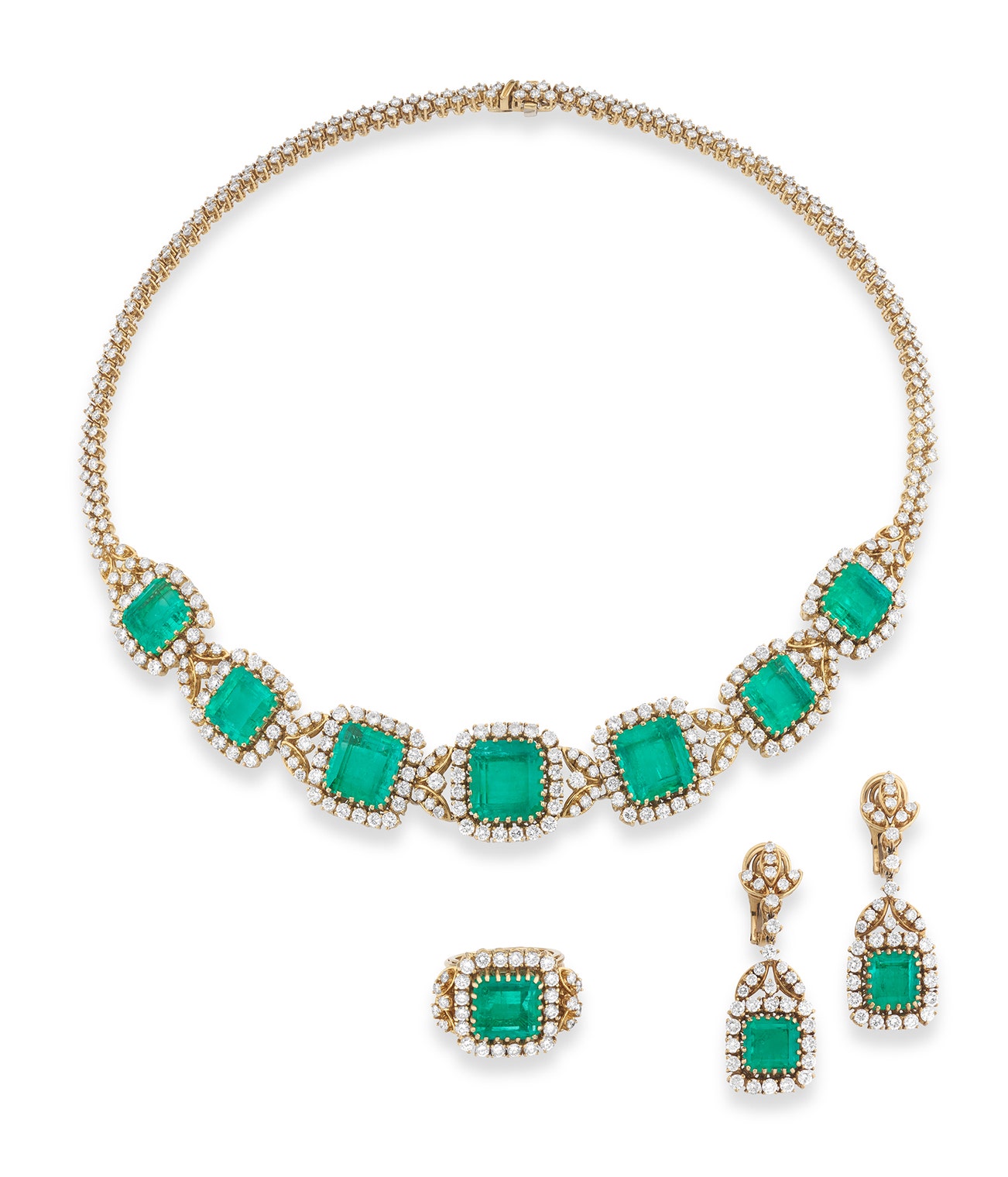 Comprising: a necklace, set with step-cut emeralds, highlighted with brilliant-cut diamonds, length approximately 420mm, a pair of earrings, length approximately 45mm, post and hinged-back fitting, and a ring, size 54, fitted case.