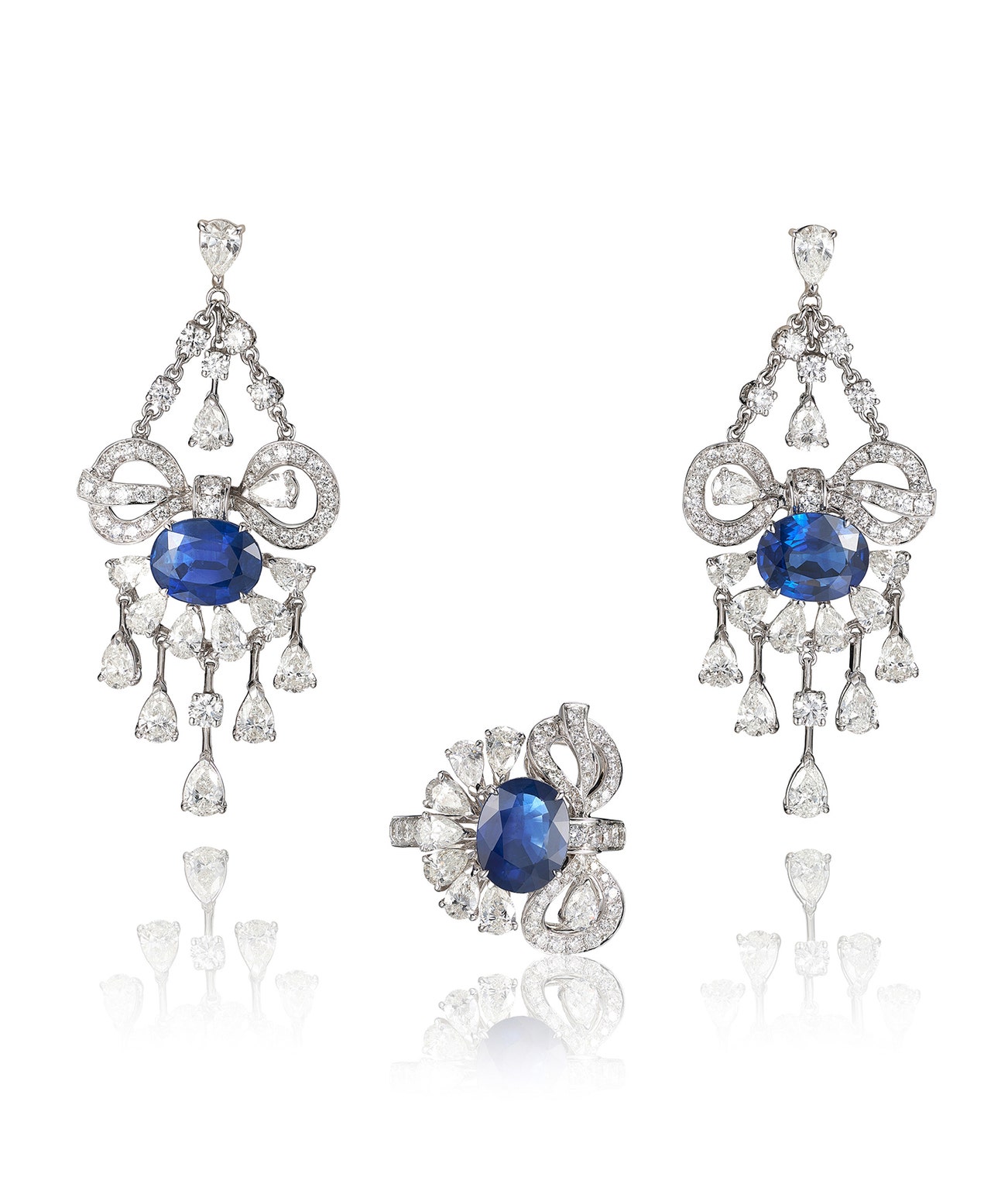 Comprising: a pair of earrings each set with an oval sapphire, highlighted with pear-shaped and brilliant-cut diamonds, length approximately 50mm, post and butterfly fittings, and a ring, ring size 54.
