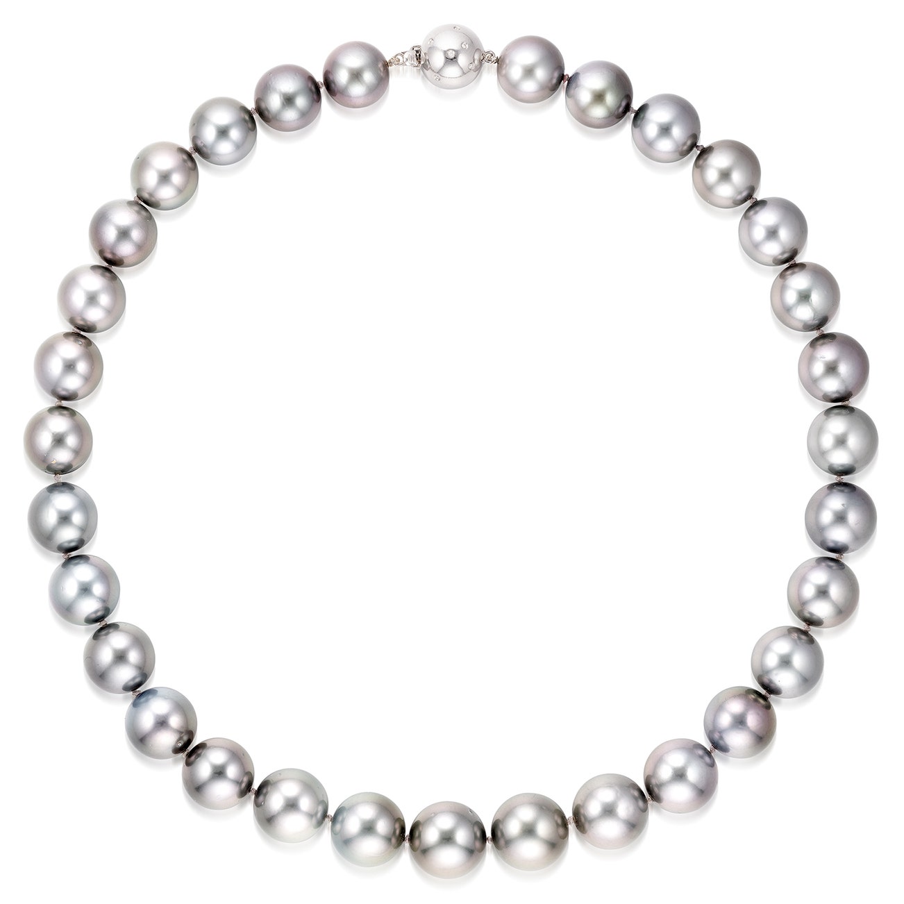 Composed of thirty-one graduated black pearls measuring approximately 13.99 to 12.02 mm, completed by a diamond-set boule clasp, mounted in white gold, length approximately 434 mm.