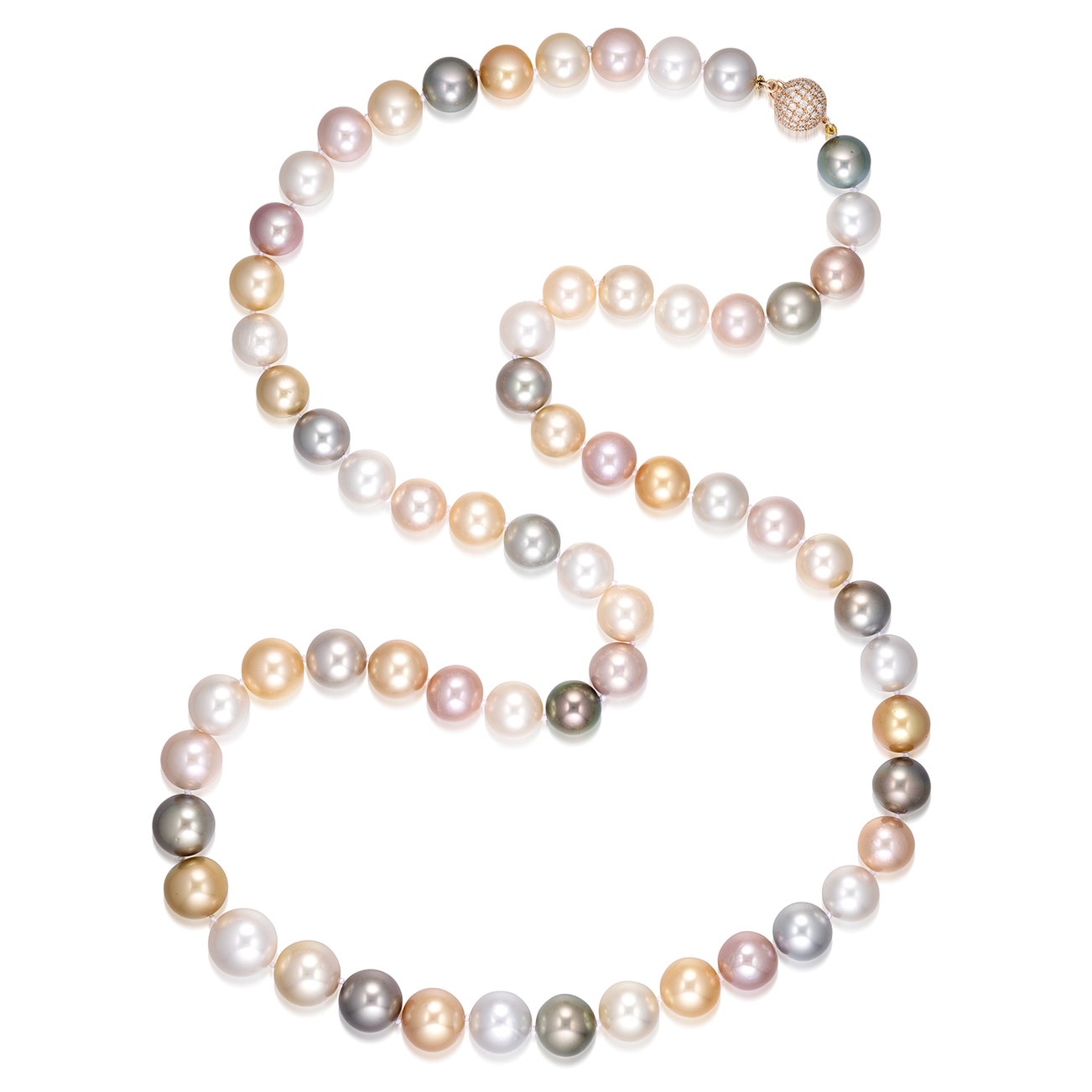 Composed of sixty-three graduated cultured pearls of various colours measuring approximately 15.60 to 12.04 mm, completed by a diamond-set gold boule clasp, mounted in pink gold, length approximately 895 mm.