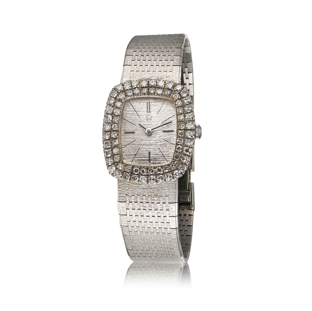 Of mechanical movement, silver dial, baton markers, sword-shaped hands, bezel set with circular-cut diamonds, white gold mesh bracelet, diameter approximately 24mm, inner circumference approximately 160mm, dial with maker's mark for Omega.