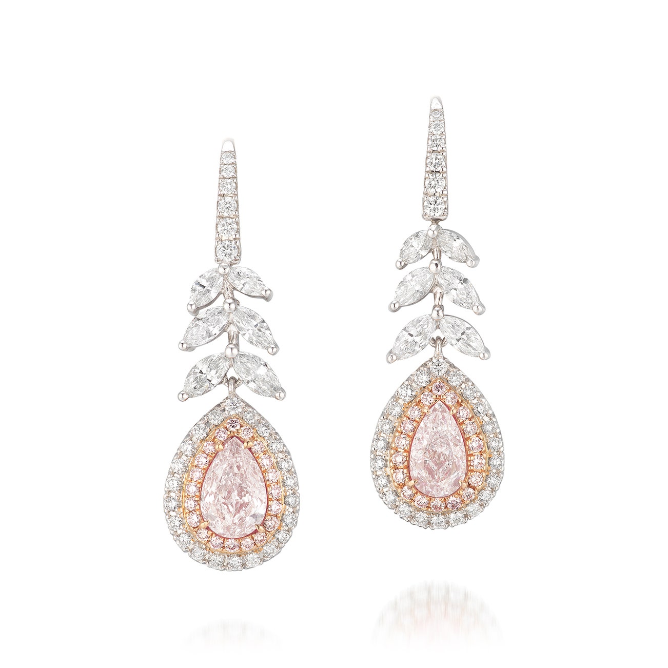 Each set with a pear-shaped faint pink diamond weighing 1.02 and 1.01 carats respectively, within a double surround of brilliant-cut diamond and diamond of pink tint, suspended from marquise-shaped diamonds, to a diamond-set hoop, mounted in white and pink gold, ear hook fittings, length approximately 35 mm.