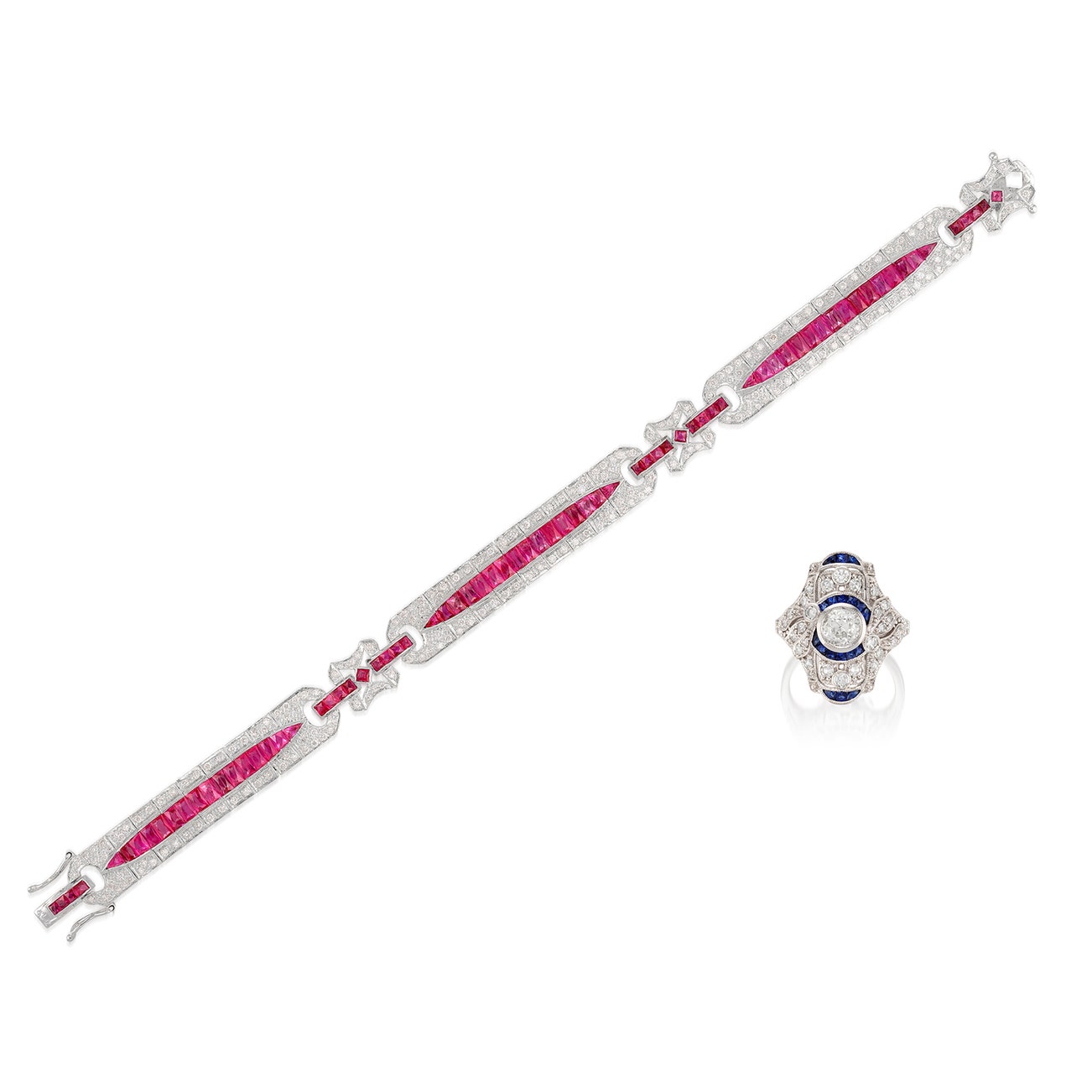 Both of geometric design, the ring centring on an old European-cut diamond weighing 0.99 carat, embellished with calibré-cut sapphires and single-cut diamonds; and the bracelet set with calibré-cut rubies and brilliant-cut diamonds, both mounted in white gold, ring size 6½, bracelet length approximately 180 mm.