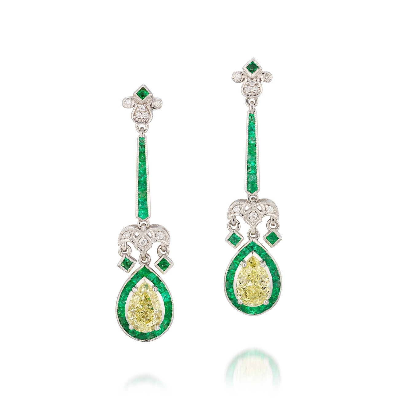 Each set with a pear-shaped diamond weighing 1.24 and 1.01 carats respectively, within a surround of calibré-cut emeralds, to the surmount set with similarly-cut emeralds and brilliant-cut diamonds, mounted in white gold, post and butterfly fittings, length approximately 40 mm.