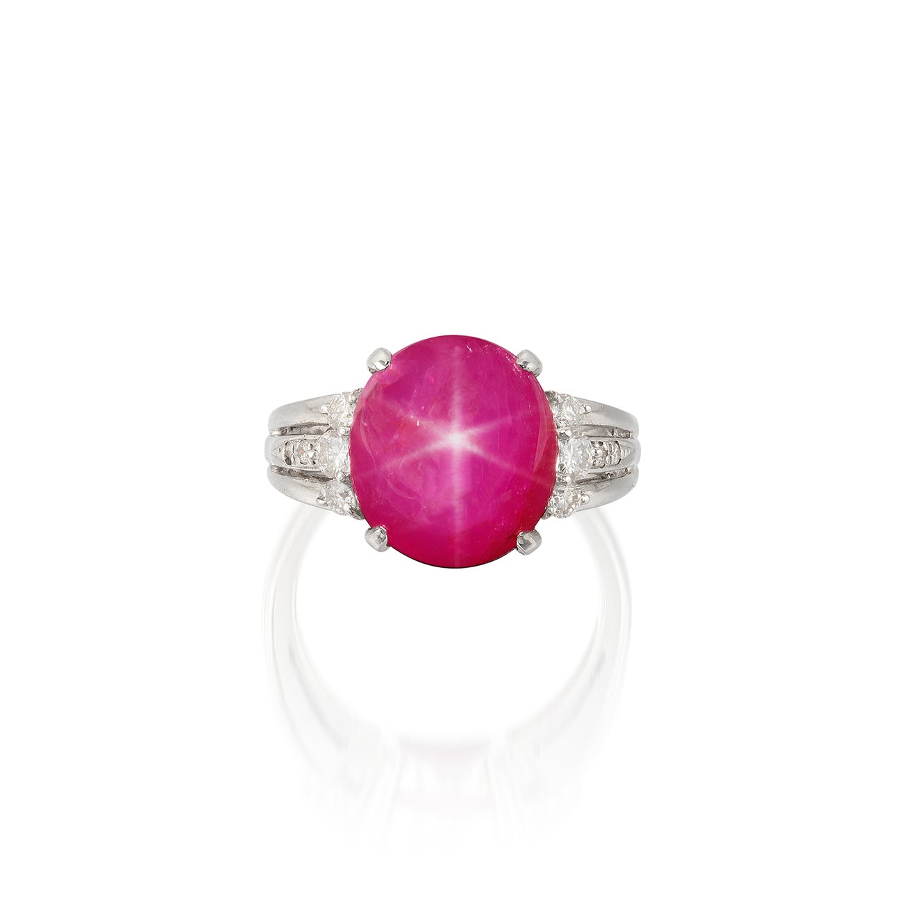 Set with an oval cabochon star ruby weighing approximately 11.32 carats, to the bifurcated shoulders decorated with brilliant-cut diamonds, mounted in platinum, size 7.