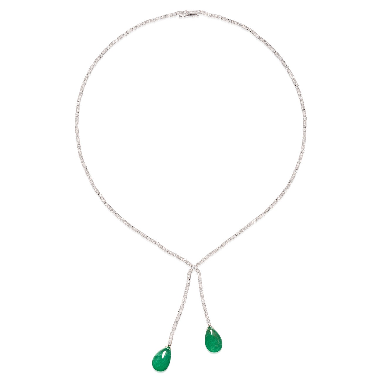 The pendant suspending two drop-shaped emeralds, to the line surmount and link necklace set with brilliant-cut diamonds, mounted in white gold, pendant length approximately 59 mm, necklace length approximately 405 mm.