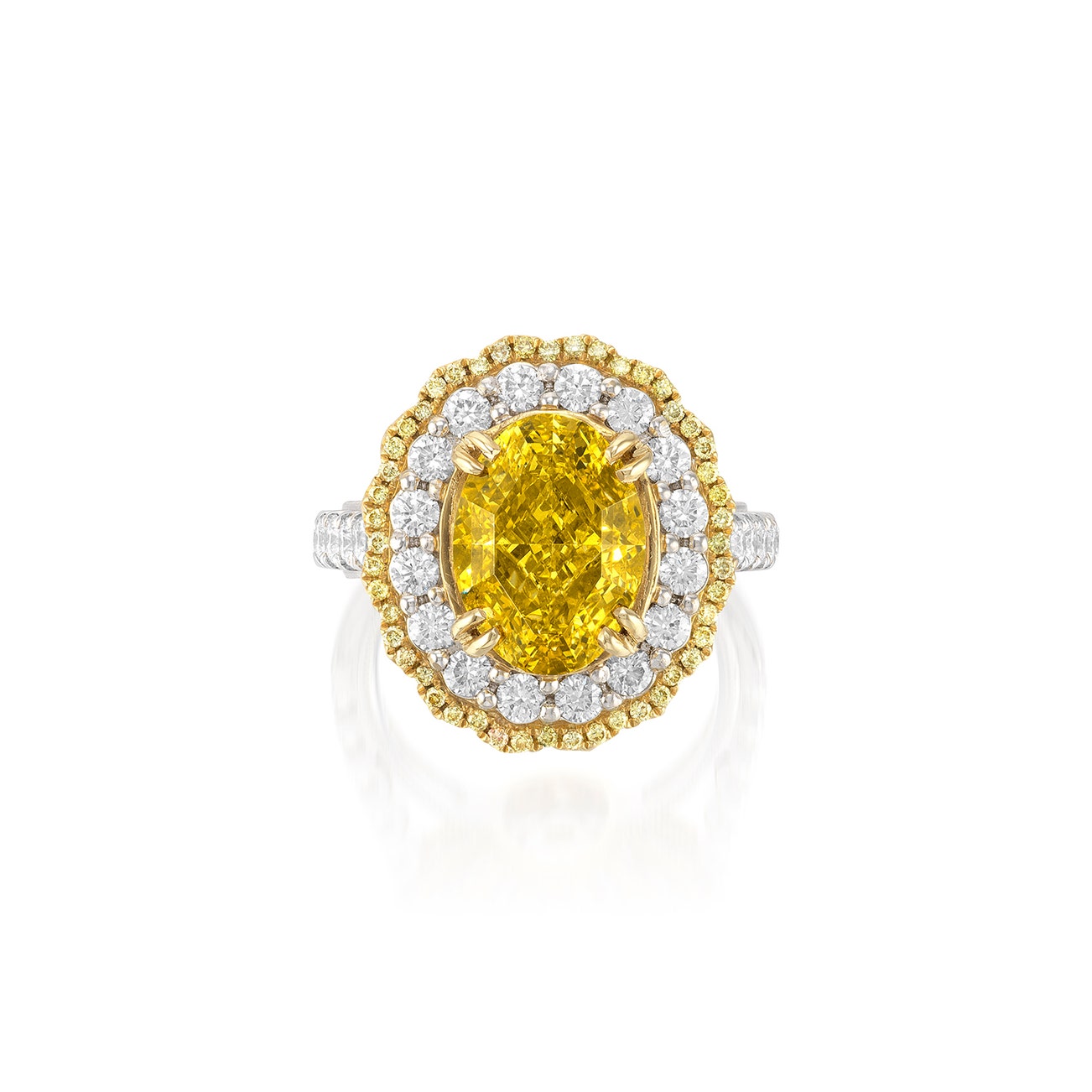 Set with an oval fancy deep brownish yellow diamond weighing 5.03 carats, within a surround of brilliant-cut diamonds, bordered by brilliant-cut diamonds of yellow tint, to the shoulders set with brilliant-cut diamond shoulders, mounted in white and yellow gold, size 6¼.