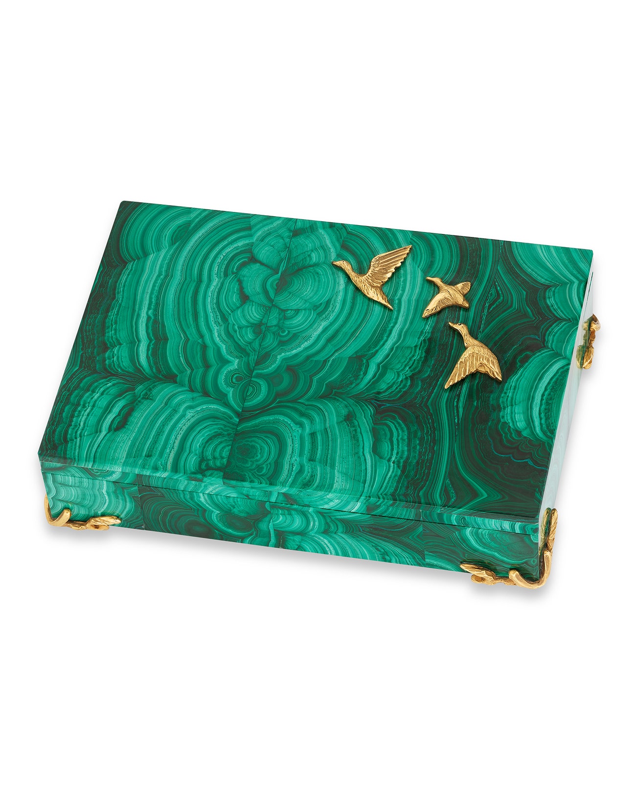 The rectangular malachite box applied with gold motifs, the interior and the back in hardstone, measuring approximately 157 x 103 x 36mm, French maker's mark for Paul Trobat and assay mark for gold.