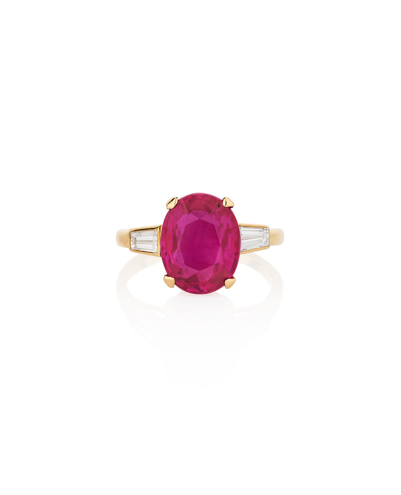 Set with an oval ruby weighing 5.03 carats, between tapered baguette diamonds, size 51.