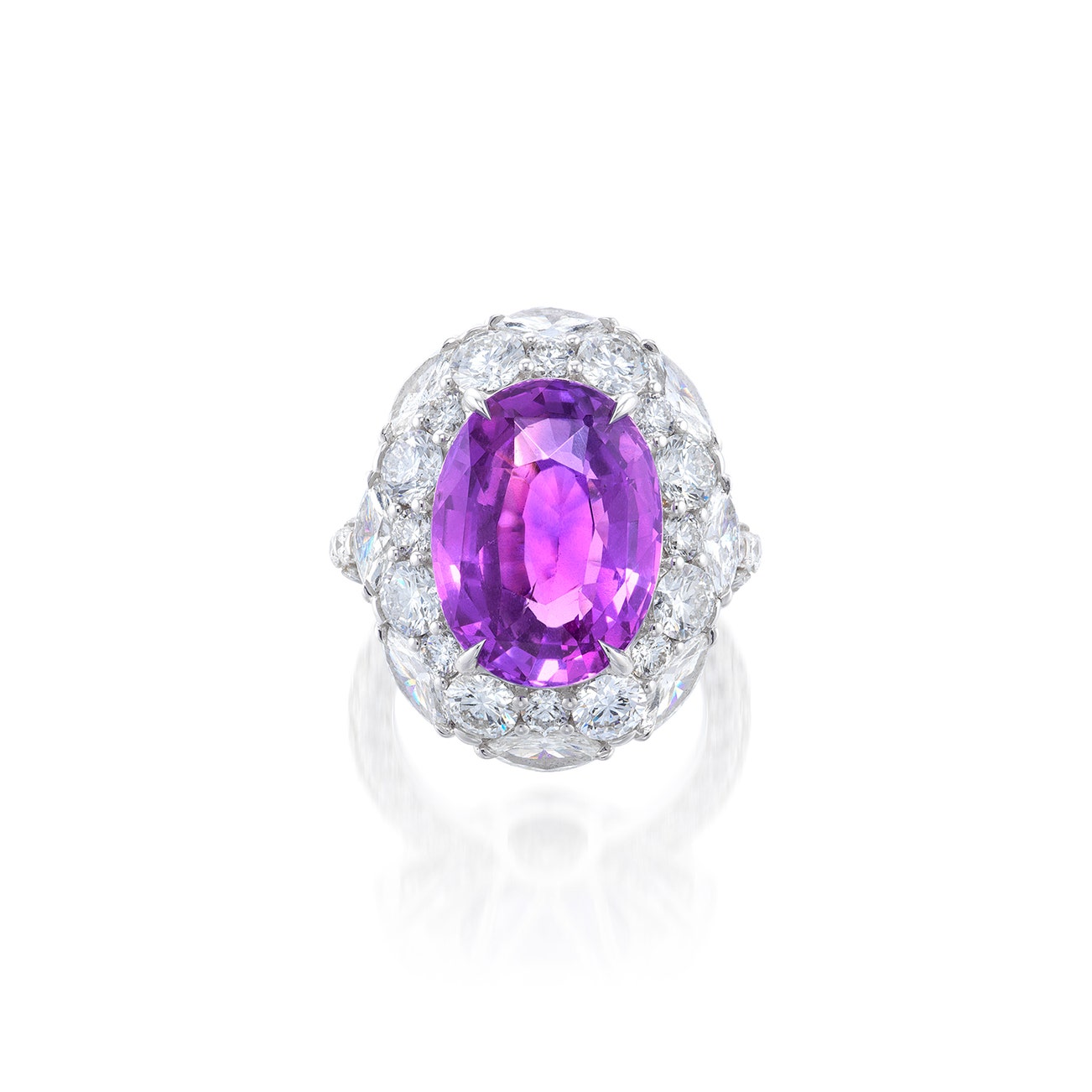 Set with an oval purple sapphire weighing approximately 7.93 carats, surrounded by marquise-shaped and brilliant-cut diamonds, to the brilliant-cut diamond shoulders, the inner shank enhanced by a brilliant-cut diamond, mounted in white gold, size 4¼.