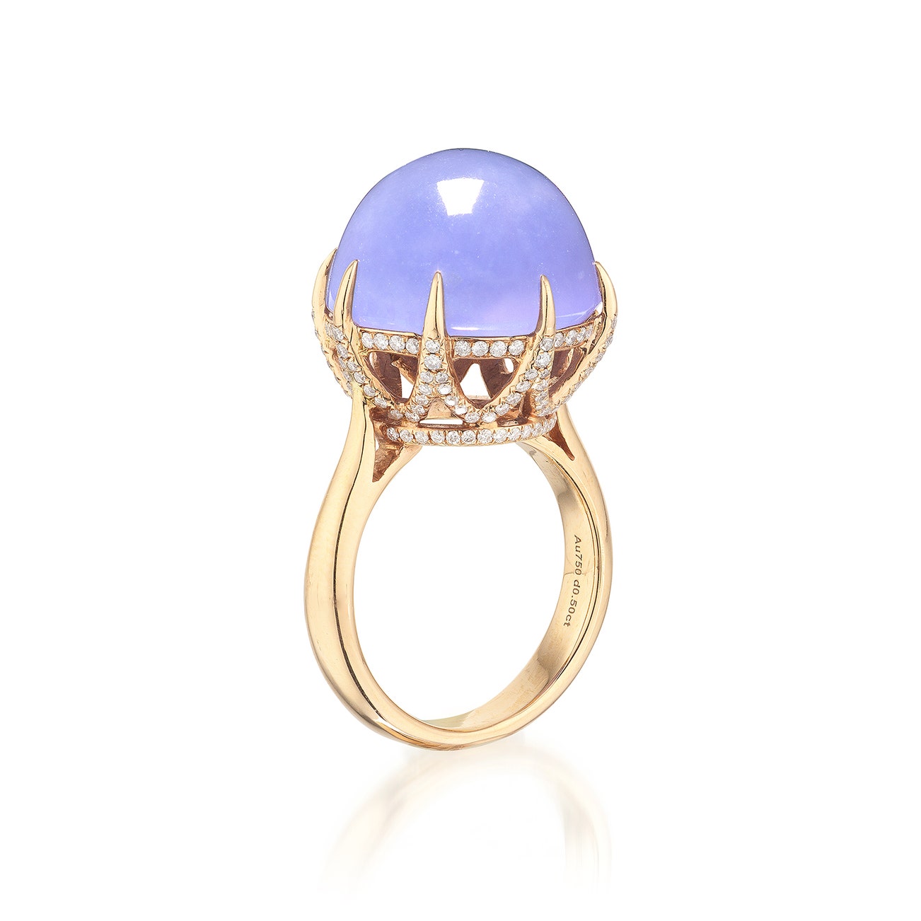 Set with a round lavender jadeite cabochon measuring approximately 15.45 to 15.77 x 11.70 mm, to the gallery set with brilliant-cut diamonds, mounted in pink gold, size 6¼.