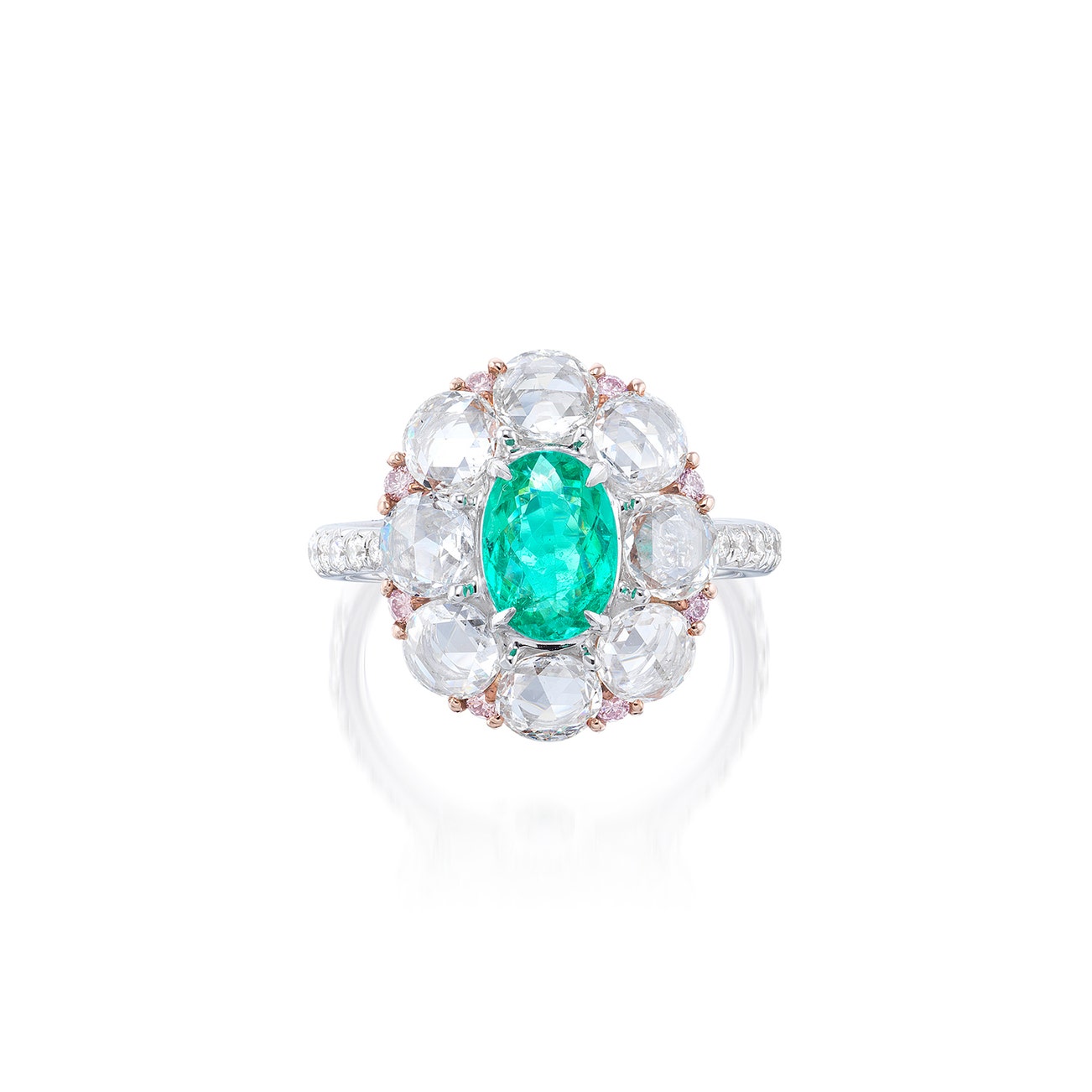 Set with an oval paraíba tourmaline weighing approximately 1.06 carats, surrounded by rose-cut diamonds and brilliant-cut diamonds of pink tint, to the brilliant-cut diamond gallery and shoulders, mounted in white and pink gold, size 6½.