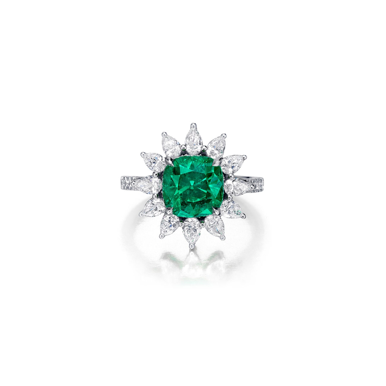 Centering a cushion-shaped emerald weighing approximately 2.72 carats, accented by pear-shaped and brilliant-cut diamonds, mounted in platinum, size 6 1/2.