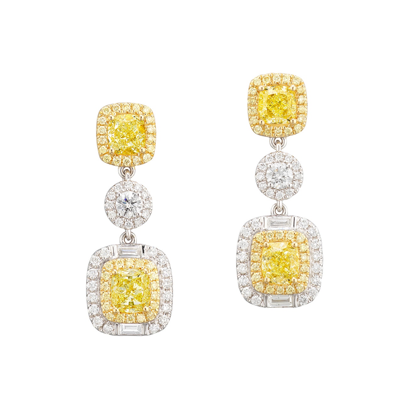 Each set with two cushion-shaped diamonds of yellow tint, connected by a brilliant-cut diamond, within surround of brilliant-cut and baguette diamonds and brilliant-cut diamonds of yellow tint, mounted in white and yellow gold, post and butterfly fittings, length approximately 25 mm.