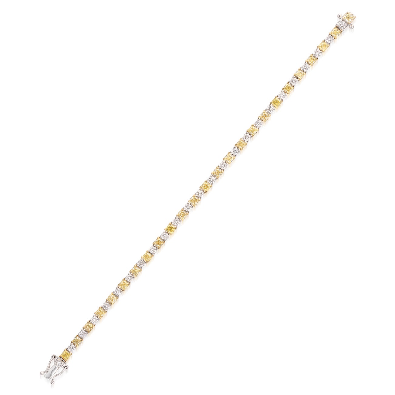 Designed as a line of alternately set cushion-shaped diamonds of yellow tint and brilliant-cut diamonds, mounted in white and yellow gold, length approximately 157 mm.