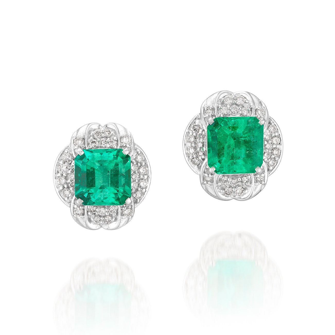 Each set with a step-cut emerald weighing approximately 4.35 and 4.25 carats respectively, decorated with brilliant-cut diamonds, mounted in white gold, post and hinged back fittings, length approximately 17 mm.