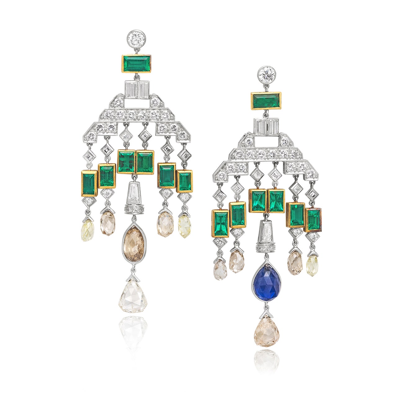 Set with mixed-cut diamonds, accented by rectangular-shaped emeralds, enhanced by a briolette-cut diamond of brown tint and a briolette-cut sapphire, mounted in platinum and 18K yellow gold, length approximately 2 1/2 inches, with maker's mark on both posts.