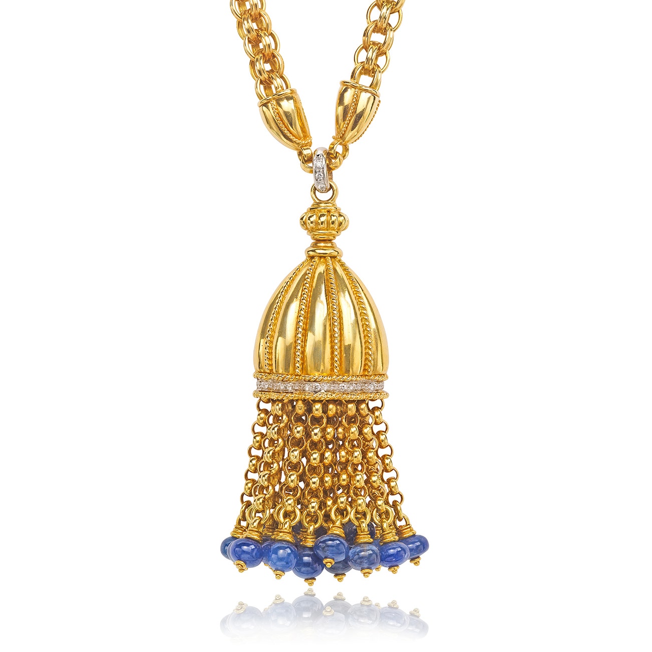 Set with sapphires beads, accented by brilliant-cut diamonds, mounted in 18K yellow and white gold, length approximately 18 inches, adjustable to 21 inches with extension, stamped ITALY.