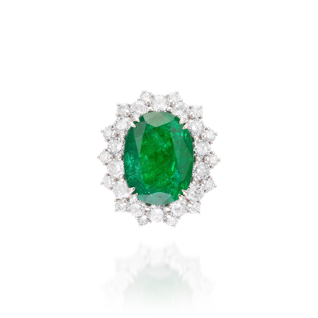 Set with an oval emerald weighing approximately 8.68 carats, surrounded by brilliant-cut diamonds, mounted in white gold, length approximately 24 mm.