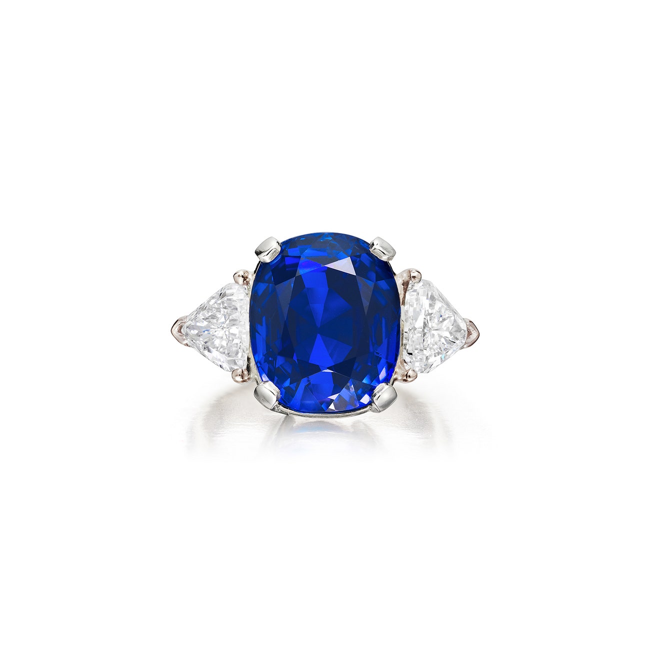 Set with a cushion-shaped sapphire weighing approximately 12.00 carats, flanked by two triangular-shaped diamonds, mounted in 18K white gold, size 6 1/2.