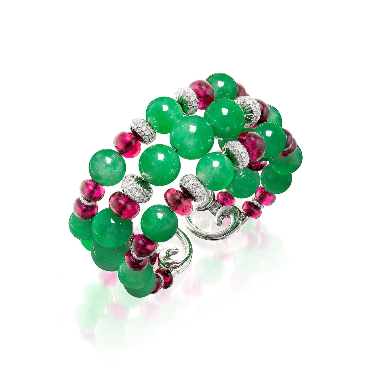 The flexible sprung band composed of twenty-three jadeite beads of green colour measuring approximately 12.09 to 8.99 mm, decorated with rubellite beads, rose- and single-cut diamonds, mounted in white gold, inner circumference approximately 143 mm.