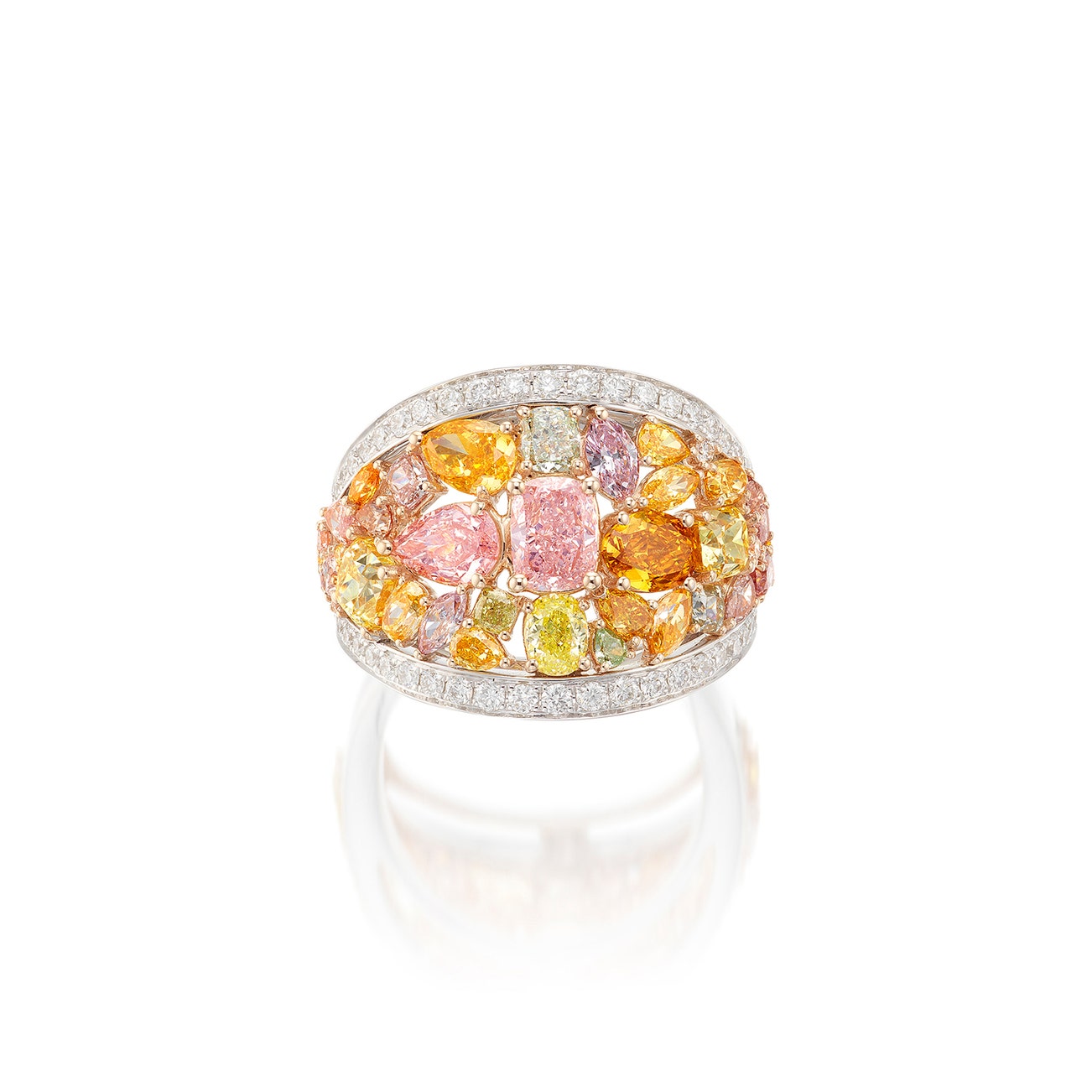 Set with thirteen coloured diamonds of various shapes, weighing 0.53 to 0.02 carat, highlighted with diamonds of various tint, to the brilliant-cut diamond border, mounted in white and pink gold, size 6¼.
