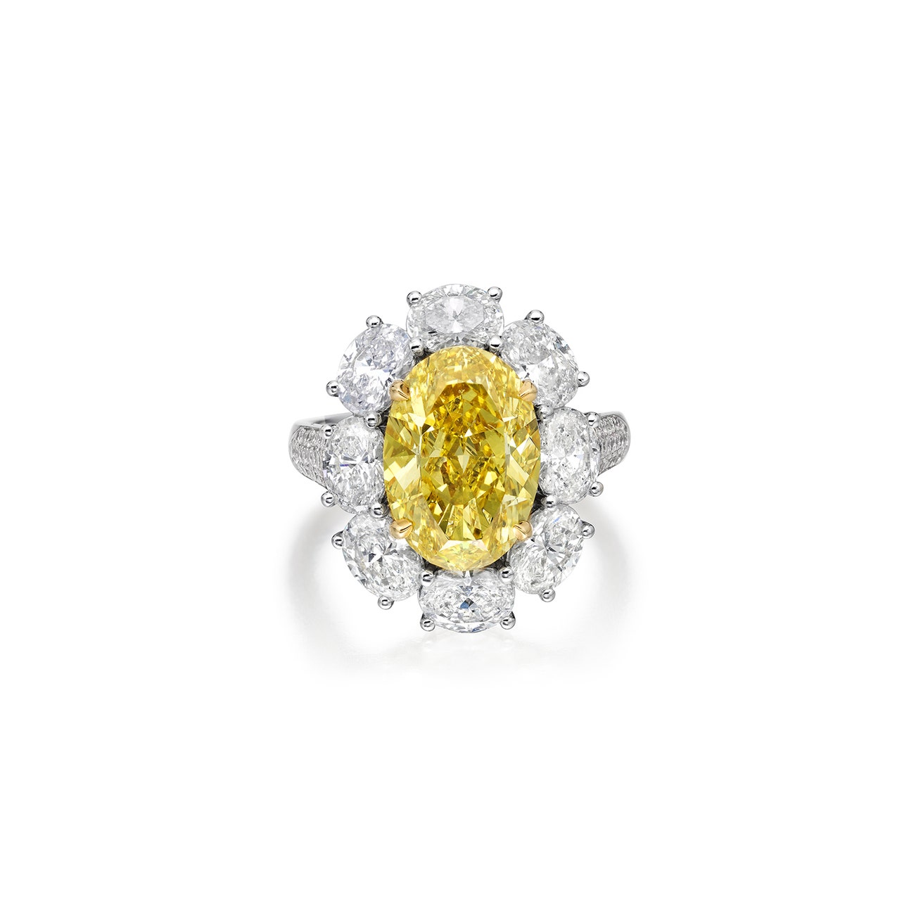 Set with an oval brilliant-cut Fancy Vivid Yellow diamond weighing approximately 4.43 carats, accented by oval-shaped and brilliant-cut diamonds, mounted in platinum, size 6 1/4.