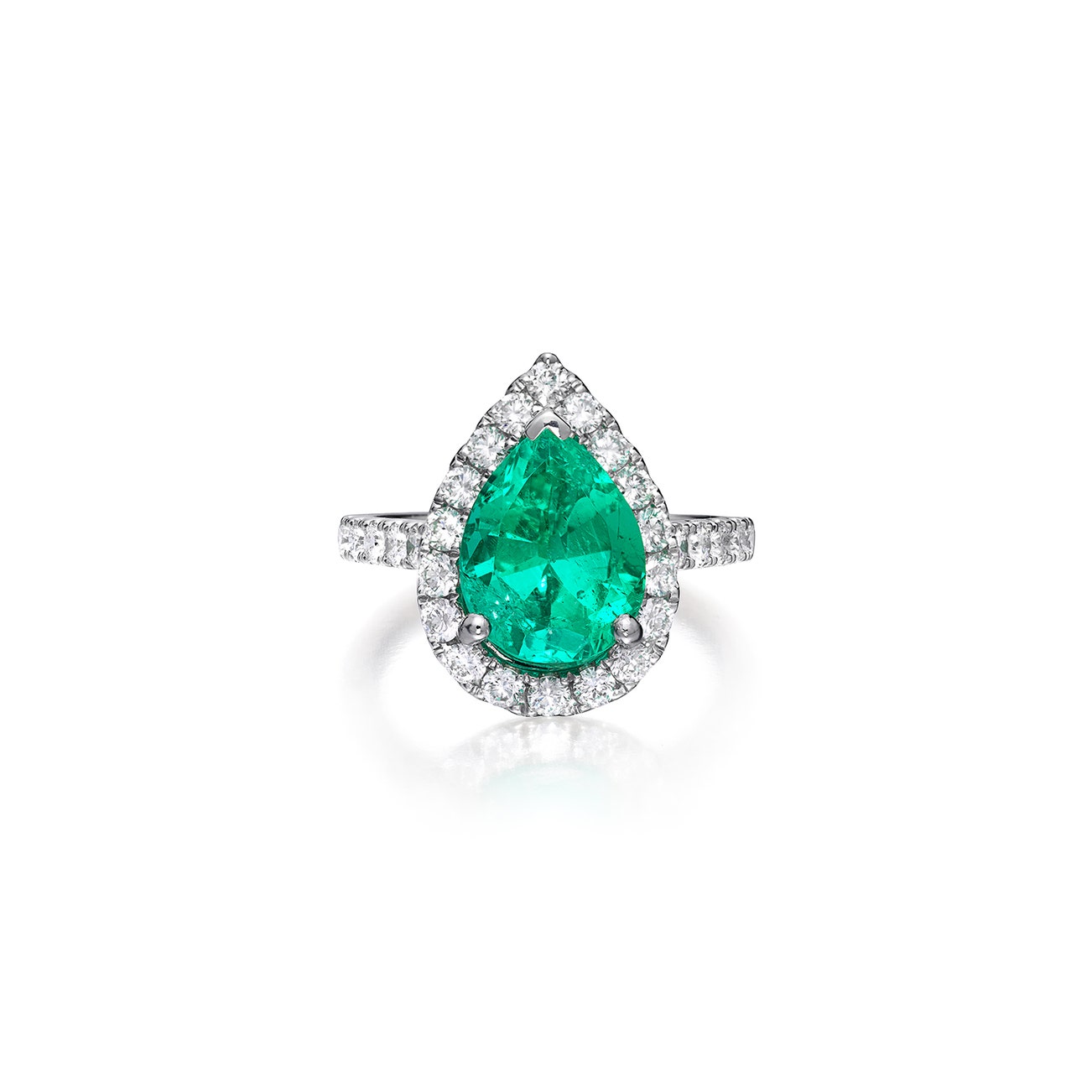 Set with a pear brilliant-cut emerald weighing approximately 3.68 carats, accented by brilliant-cut diamonds, mounted in 18K white gold, size 6 3/4, with maker's mark.
