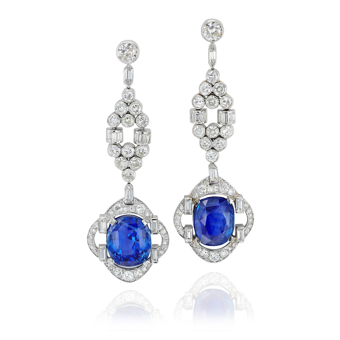Each set with a cushion-shaped sapphire weighing approximately 10.79 carats and 12.80 carats, accented by circular-cut and baguette diamonds, mounted in platinum, length approximately 2 1/2 inches, numbered, with French assay mark and maker's mark.