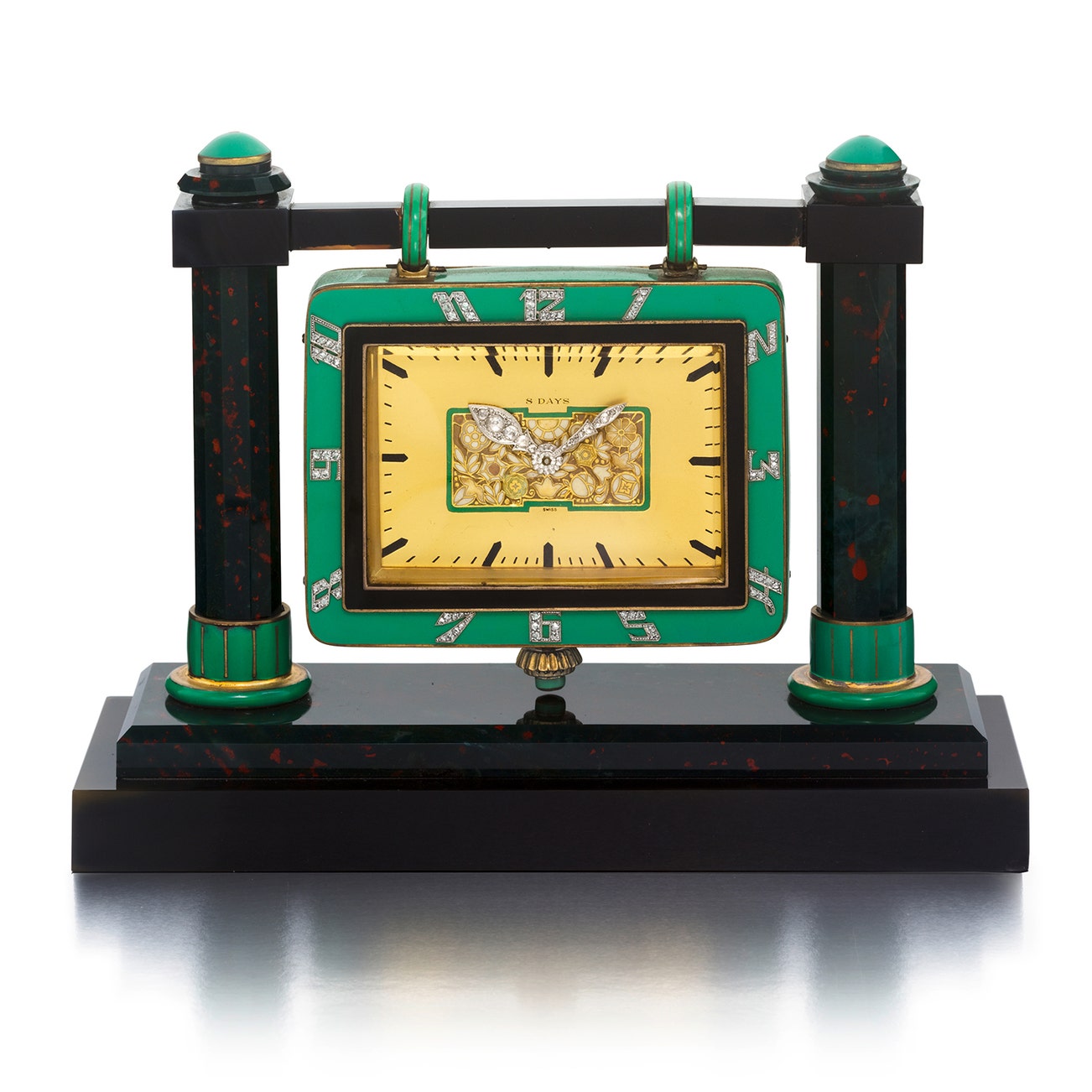 Art Deco Bloodstone, Enamel and Diamond Table Clock