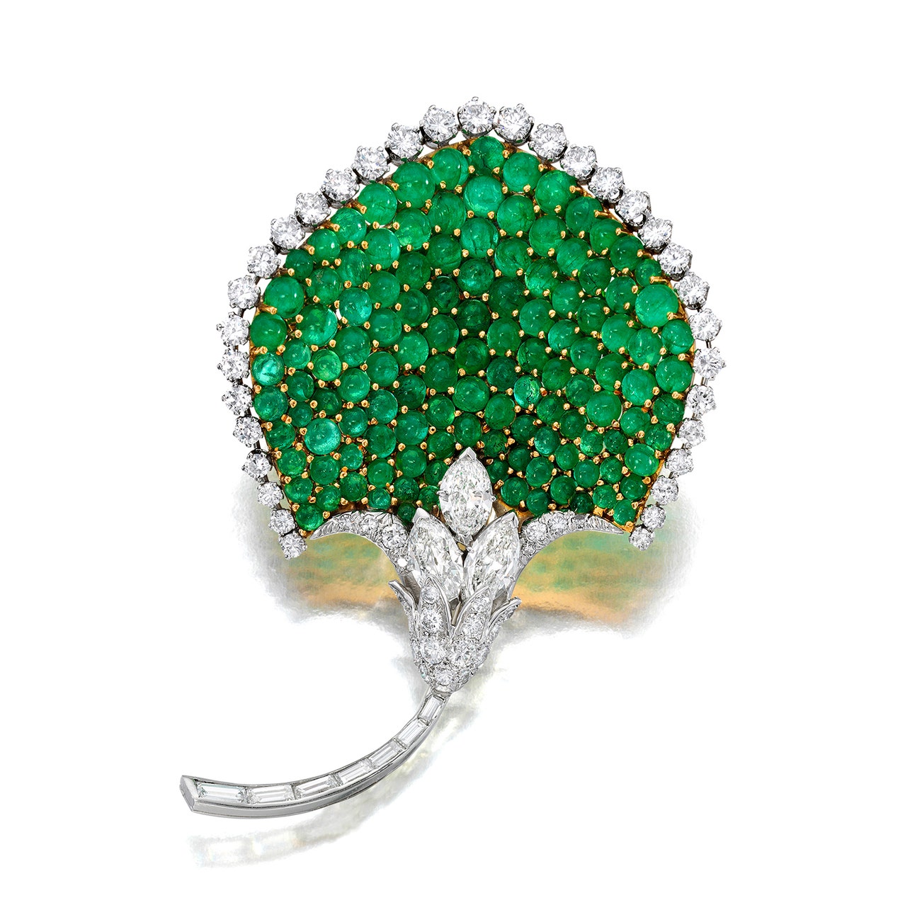 Of fan design, set with round emerald cabochons, accented by circular-cut, marquise-shaped and baguette diamonds, mounted in platinum and 18K yellow gold, length approximately 3 inches, with French assay mark and maker's mark.